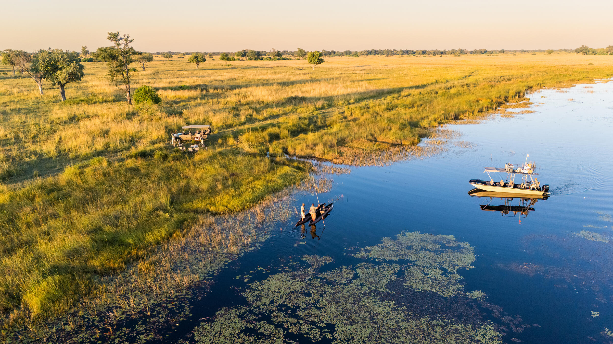På Setari Camp utforskar du Okavangodeltat med motordrivna båtar, mokoros eller till fots med campens skickliga guider.