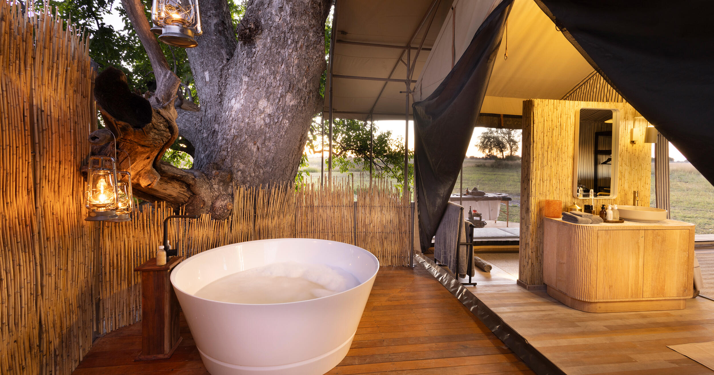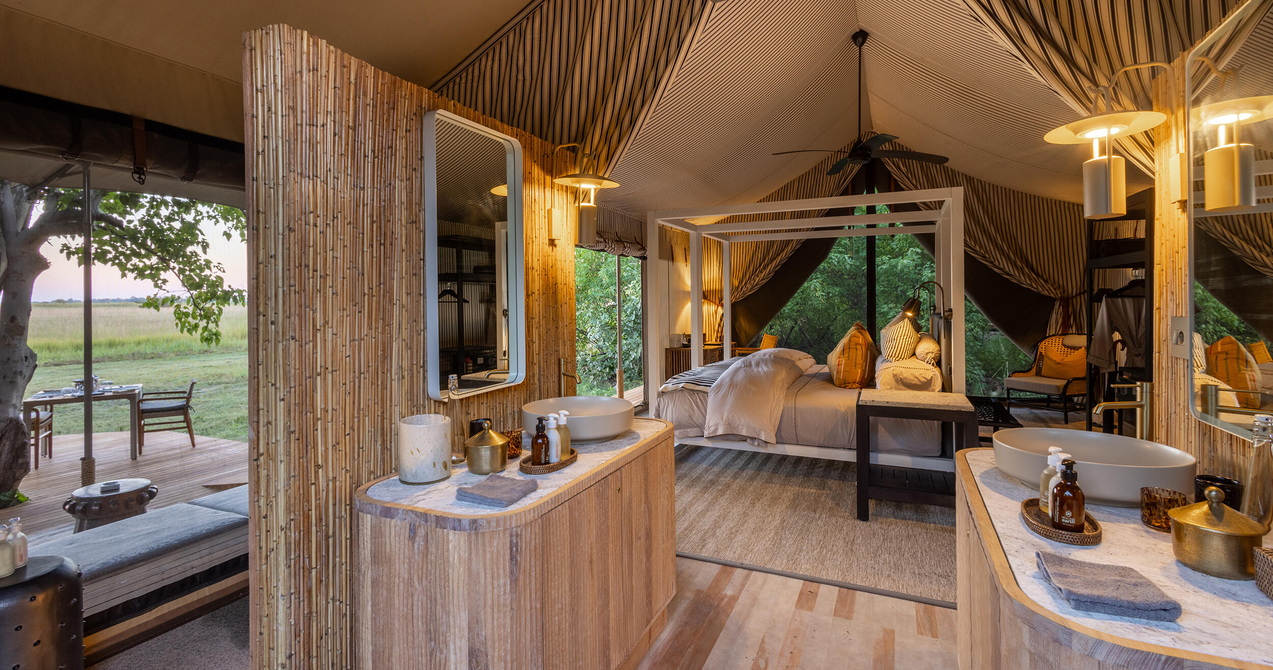 Campen består av tio autentiska safaritält, vilka alla är individuellt utformade och perfekt placerade för att maximera utsikten över omgivningen. Efter en dag i deltat finns det inget bättre än att glida ner i infinitypoolen, omgiven av vildmarkens ljud och vackra vyer.