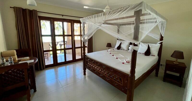 Här bor du i en mysig stuga i en tropisk trädgård med pool. Stugan har ett litet kök med kylskåp och spisplattor, luftkonditionering och egen veranda. Du har tillgång till grannhotellet Mwezis restaurang och strandområde.