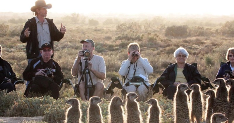 När du gör en surikatsafari vaknar du tidigt innan solen går upp, tar med dig kaffe och frukost och sätter upp stolar där surikaterna lever under marken. Sen väntar du.
